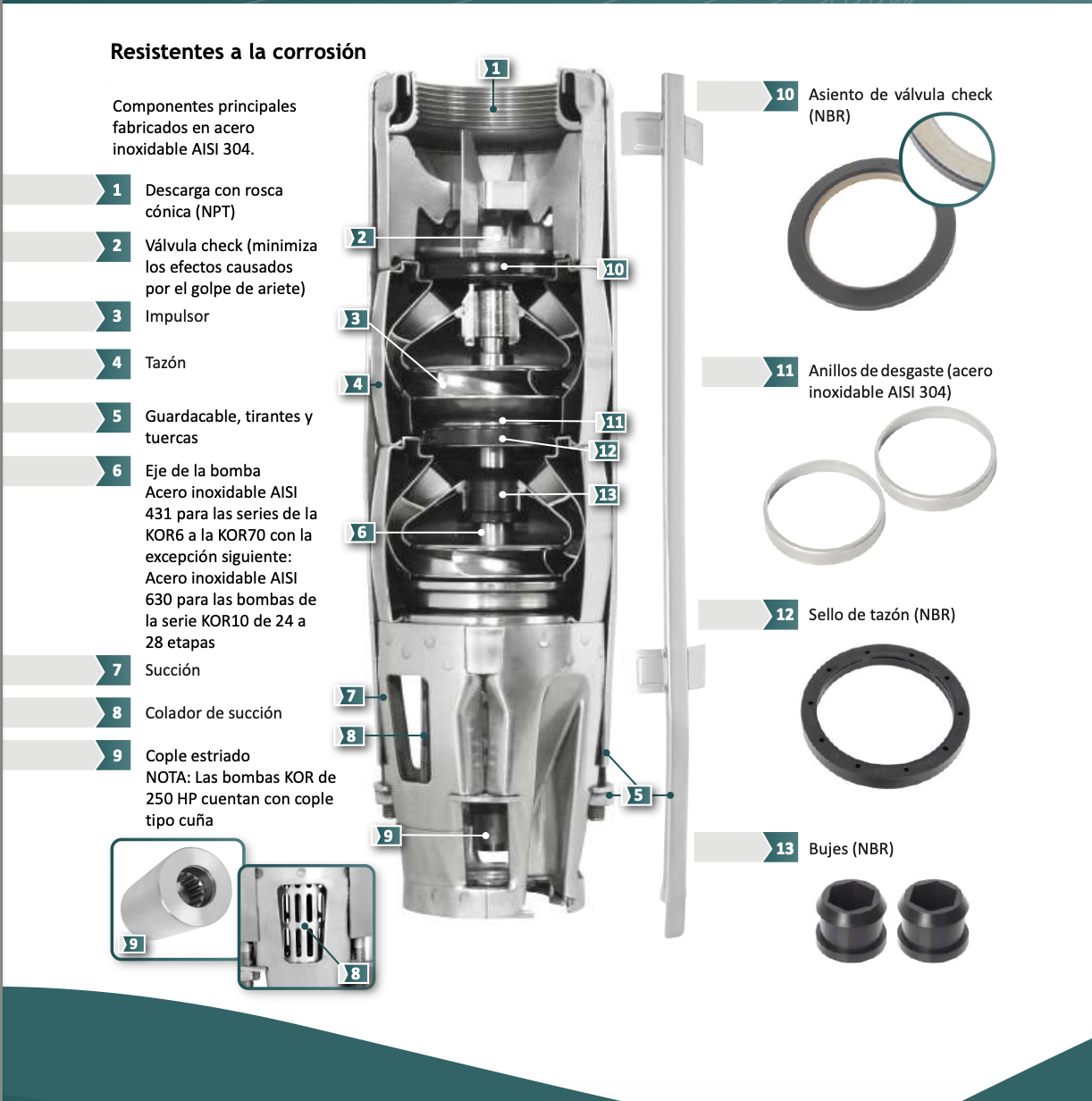Las bombas sumergibles ALTAMIRA Serie KOR15 están diseñadas para aplicaciones de bombeo de gran capacidad donde se requieren altos caudales y excelente eficiencia hidráulica. Su construcción completamente en acero inoxidable proporciona gran resistencia a la corrosión, alta durabilidad y operación confiable incluso en condiciones de trabajo exigentes.